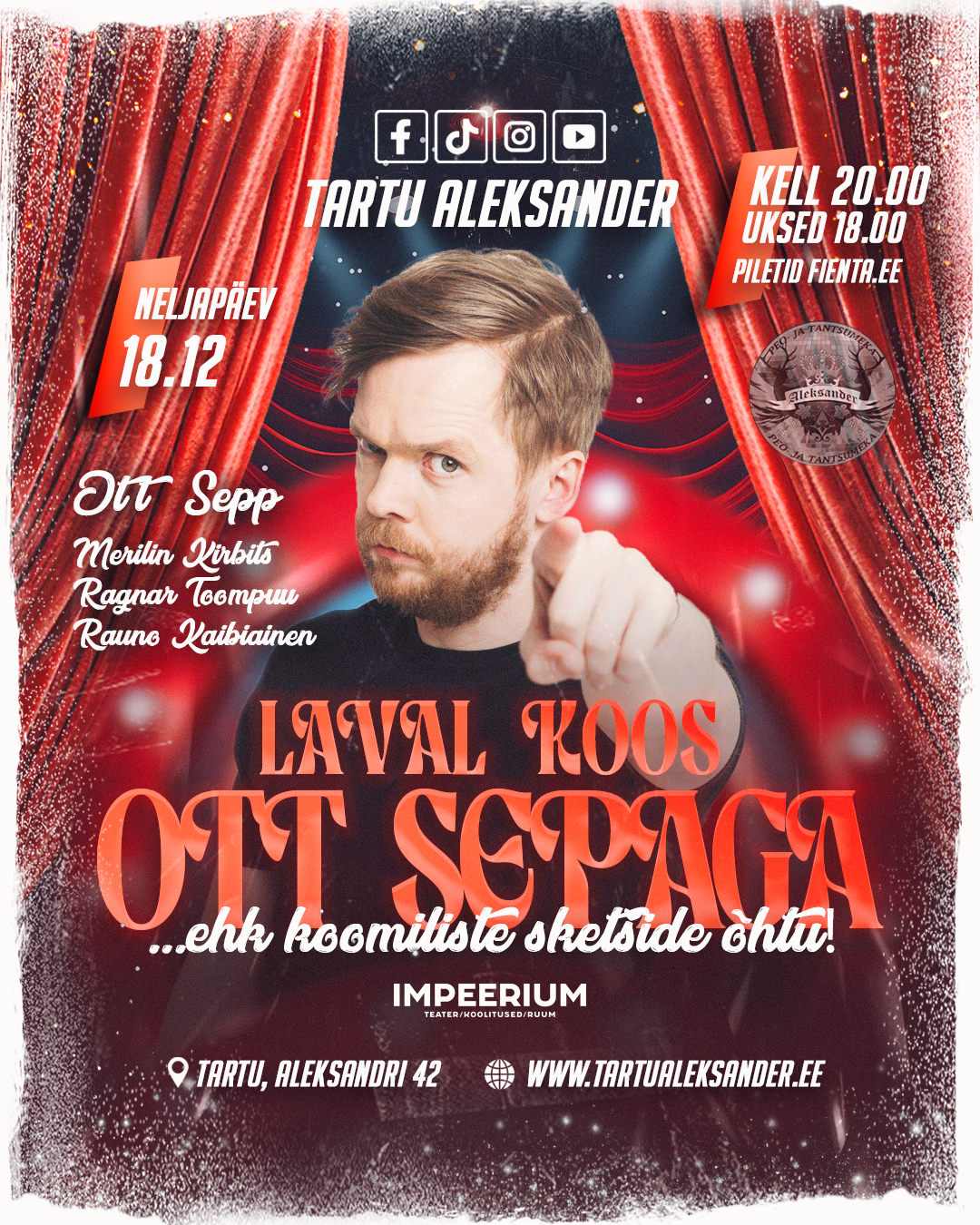 Seekord astub ootamatutesse olukordadesse OTT SEPP – näha saab kohapeal sündivaid sketše, humoorikaid tegelasi, kaasahaaravaid stseene, lauluhitte jpm. Ott Sepp on vabakutseline näitleja, lavastaja, saatejuht ja stsenarist. Ta lõpetas 2004. aastal Eesti Muusikaakadeemia Kõrgema Lavakunstikooli 21. lennu.